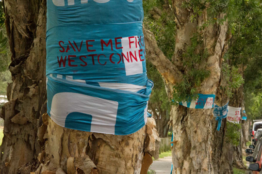 trees_kerbside_euston_road_01 Published 11 January, 2017 at 540 × 359 in Mass demonstration at Sydney Park Various Images of trees ‘wrapped’ with blue ribbons for the WAG “Uprooted” Event.
