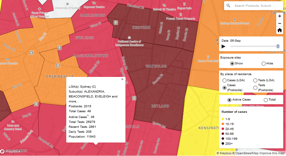 But just in case you haven’t quite gotten around to getting your vaccination yet, a reminder that we’ve had a bit of spike in cases lately – there’s currently some 36 active cases in postcode 2015 (Alexandria, Beaconsfield, Eveleigh) and there’s another 130 active cases in postcodes 2016 and 2017 (Redfern, Waterloo, Zetland).