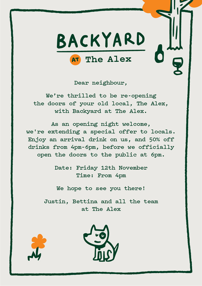 The Alex will officially open it’s doors again on Friday 12th November at 6pm. However for locals there is a special early session from 4pm with half-price drinks.