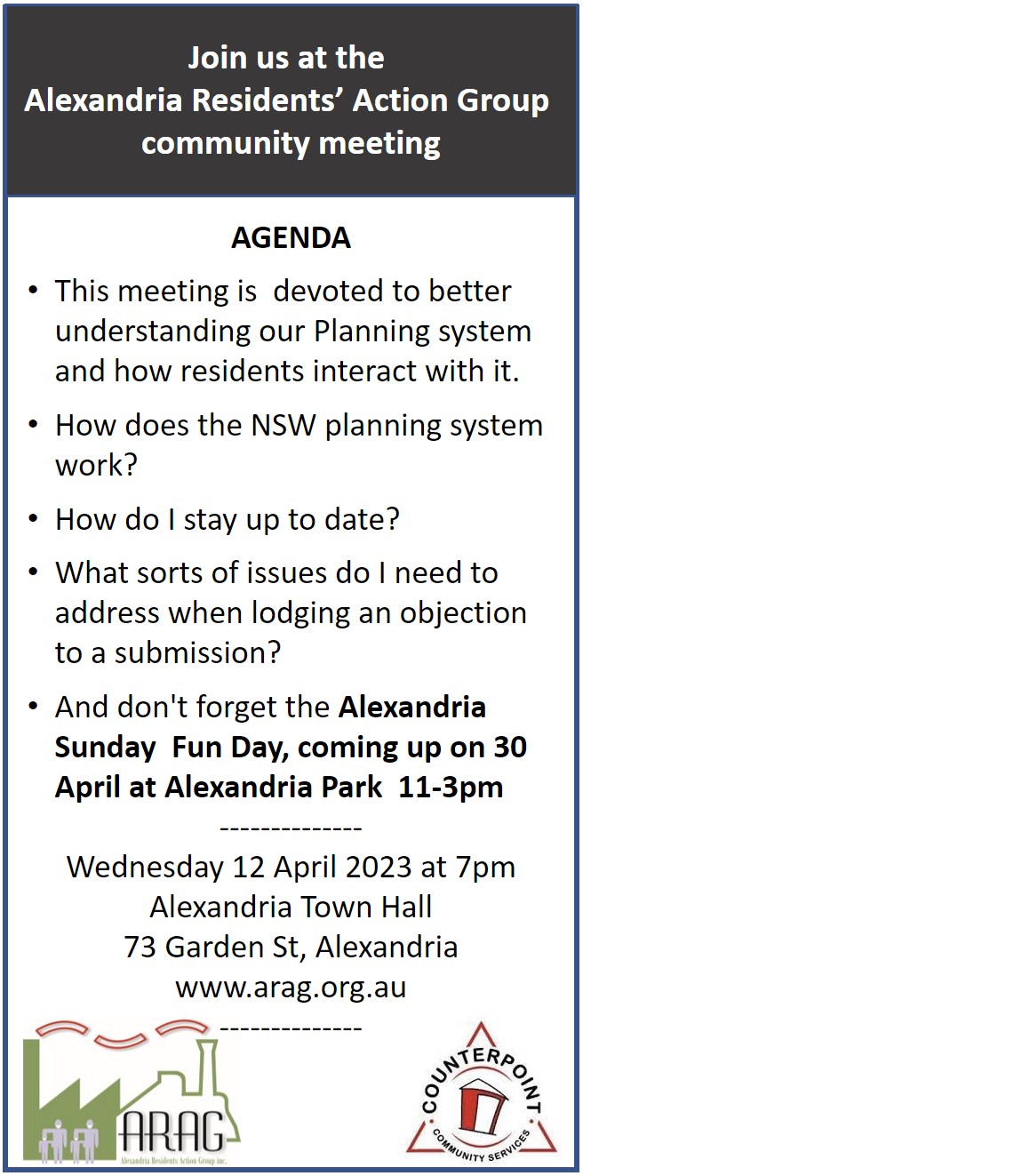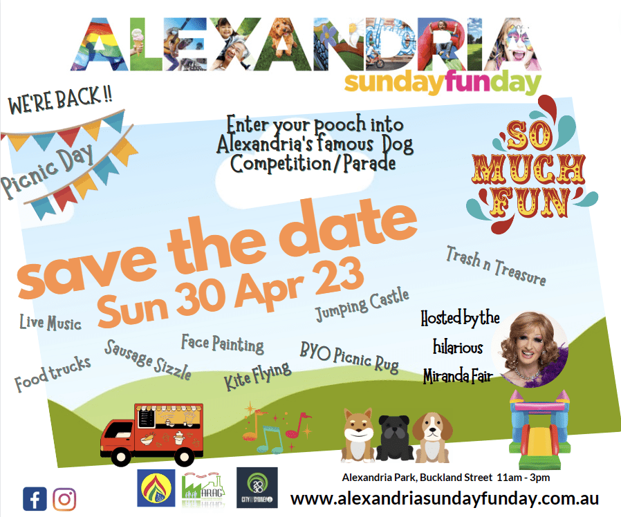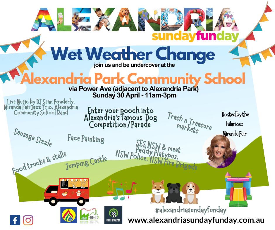 Due to a wet weather forecast we are moving the Alexandria Sunday FunDay to The Alexandria Park Community School, entrance via Power Avenue, Alexandria. Come on down and support our fabulous local fair after 3 years of absence. Huge thanks to Alexandria Park Community School where we can take advantage of their large undercover areas. Lots of fun on to be had, the dog competition hosted by Miranda Fair and prizes by PetO Alexandria, facepainting by Functions of Fun, come and find some treasure at our local Trash n Treasure markets, Live music with DJ Sean Your Local DJ, Miranda Fair and Jazz Trio. Pet stalls by PetO Alexandria, Dogs in Town and Paw Empire. Support our local community stalls and say hello to: Friends of Erskineville, Alexandria Scouts, NSW SES and meet Paddy the Platypus, Redfern Police will have a display vehicle, Alexandria Fire Brigade and Cliff Noble Centre. Enjoy the Jumping castles by Sydney Jumping Castle Hire, Food trucks & stalls by: Lit Canteen, Sharon Kwan Kitchen, Andy’s dumplings , Happy Grumpy Coffee, Ola Lola Catering & Events, The Daily Espresso, Dairy King, Pop’s Cornshack, cake stalls by the Alexandria Park Community School & the Alexandria Residents Action Group – ARAG Sausage Sizzle. Huge shout out to Brad Gillespie Real Estate in sponsoring our stage and CplusC Architects for sponsoring our jumping castle. Can’t wait to see you all there. We