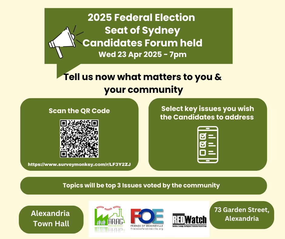 The 2025 Candidate’s Forum, co-hosted by Friends of Erskineville, Redwatch and ARAG will be held on: