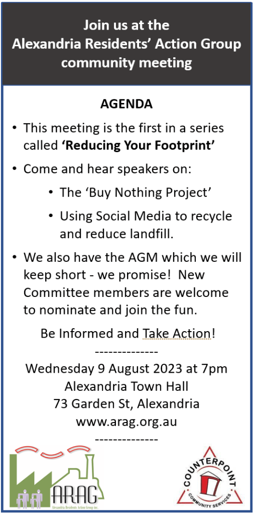 Join us for our ARAG community meeting this Wednesday, 8 August 2023, at 7pm at Alexandria Town Hall, 73 Garden Street, Alexandria.